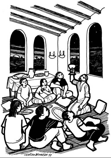 1. PRESENTACIÓN DEL TEMA La vida se mantiene con el alimento. Sin comer nadie puede existir. Para vivir el mandamiento Nuevo de Jesús también necesitamos alimentarnos. Y este alimento es el mismo cuerpo de Jesús. La noche en que lo iban a apresar, quiso él celebrar una comida de despedida con sus amigos. Fue una fiesta íntima. Conversaron largamente. Insistió en que nos debemos llevar como hermanos. Y para fortalecer esta hermandad se ofreció él mismo como alimento. Nosotros actualizamos en nuestros días este ofrecimiento de Jesús celebrando la Santa Misa. En ella Cristo se nos da como alimento. Con la Comunión de su cuerpo Jesús nos capacita para que podamos vivir sus mismas actitudes. A través de la Eucaristía hacemos presente entre nosotros la fuerza del amor de Cristo, que le llevó a comprometerse hasta las últimas consecuencias. Comer el pan que da vida es alimentar nuestra vida de los mismos ideales por los que luchó Jesús. Su compromiso por el amor y la justicia se convierte así en el pan de nuestra vida. Comer el cuerpo de Cristo es alimentarse de la fuerza de Jesús pobre, para que los ideales de la hermandad continúen por las venas de todos los oprimidos. El pueblo se alimenta de lo mejor del pueblo, que es el mismo Jesús. No pensemos más que la comunión es sólo cosa de beatas, o de gente desocupada. Comulgar es una necesidad de la gente comprometida. Necesitamos comulgar para estar siempre unidos a Jesús y poder así seguir adelante nuestro compromiso por los hermanos. 2. ORACIÓN INICIAL Recemos unidos el credo o el Padre nuestro 3. LECTURA DEL EVANGELIO Lucas 22, 14-20: Última Cena. 4. DIÁLOGO COMUNITARIO Ver: a) ¿Hemos tenido alguna vez una comida especial para festejar algo importante? Contar algún caso. b) Relacionar el caso anterior con la comida de despedida y envío que celebró Jesús con sus amigos. c) ¿Por qué va la gente a Misa? ¿Qué piensa la gente que es comulgar? Pensar: a) ¿Por qué decimos que en la Eucaristía anunciamos la muerte y resurrección de Cristo? b) ¿Vale la pena ir a Misa si no nos ponemos en paz con los demás? ¿Por qué? (Ver Mateo 5, 23-24) c) El que come el Cuerpo de Cristo, ¿por qué tiene energías especiales para ayudar a sus hermanos? Actuar: a) ¿Podemos compartir nosotros algo en las Misas? b) ¿A qué compromiso nos obliga la Eucaristía para con los que están en necesidad? c) ¿Qué hacer para que la energía de Jesús actúe dentro de nosotros en la familia, en los grupos de amigos y con los compañeros de trabajo? 5. DINÁMICA Levantarse todos y que cada uno dé algo simbólico suyo a otro compañero/a. No importa que sea una cosa pequeña. Lo importante es que con ese regalito estamos señalando nuestra disposición de ayudar. 6. ORACIÓN COMUNITARIA