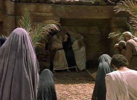 El Jesús tan humano que es divino: El relato de la pasión destaca los rasgos más humanos de Jesús. Comprende la debilidad de Pedro y le anuncia una restauración. Cura al siervo del sumo sacerdote, tocándole con la mano. Fija su mirada en Pedro, cuando lo niega. Consuela a las mujeres de Jerusalén que lloran y se lamentan tras de él. Acoge en el Paraíso al ladrón arrepentido... Así manifiesta la Bondad que lo habita. La misma sepultura de Jesús parece que oculta una sorpresa. Las mujeres, que siguieron a Jesús y quedaron afectadas por él, sienten que algo va a ocurrir detrás de la piedra que cubre el sepulcro. El evangelista que ésto relata, sabe que la Gracia estallará de un momento a otro. Por de pronto, es bueno descansar el sábado.