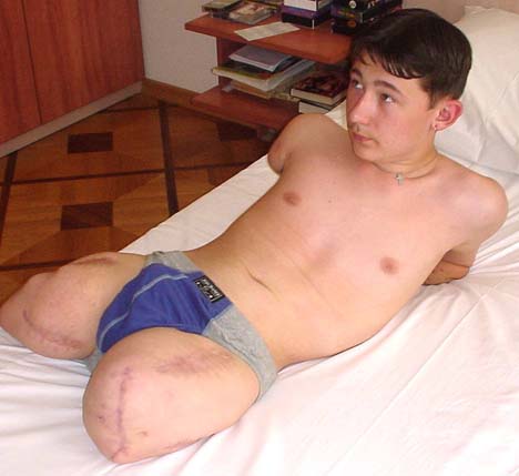 . Aljoscha Talai ... ... nació el 22 de enero de 1983 en Gomel (Rusia). El 8 de mayo de 1999 Aljoscha se hirió gravemente al pisar en un bosque una mina de la 2ª Guerra Mundial. Se le tuvieron que amputar las dos piernas por encima de las rodillas, también el brazo derecho muy cerca del hombro y la mano izquierda. ¡Amputación cuádruple a los 16 años! |