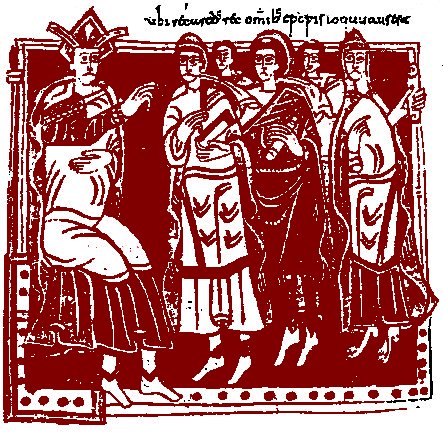 El Rey Recaredo hablando a los Obispos en el Concilio III de Toledo, año 589. Códice Vigilano, fol. 145, Biblioteca del Escorial