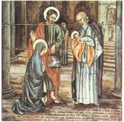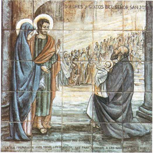 Las gentes se agolpan junto a la Sagrada Familia y al anciano sacerdote, y están mirando la Luz. Son los albores del cumplimiento de las palabras de Simeón, quien agradece a Dios haber podido ver al Mesías antes de morir. José es feliz con Jesús. El no es su padre en el orden natural, pero lo es espiritual y afectivamente mucho más que si lo fuera. José es también nuestro padre en el orden espiritual, y goza viendo la Luz -que es Cristo- en nuestras almas. Verdaderamente hay alegría en el cielo cuando nosotros -pecadores- nos arrepentimos, cuando reconocemos con sinceridad la verdad de Dios y la fe se hace vida en nuestra conducta.