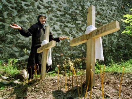 Anciana serbia llorando frente a la tumba de su hija, enterrada en el Monasterio Ortodoxo de Pec.