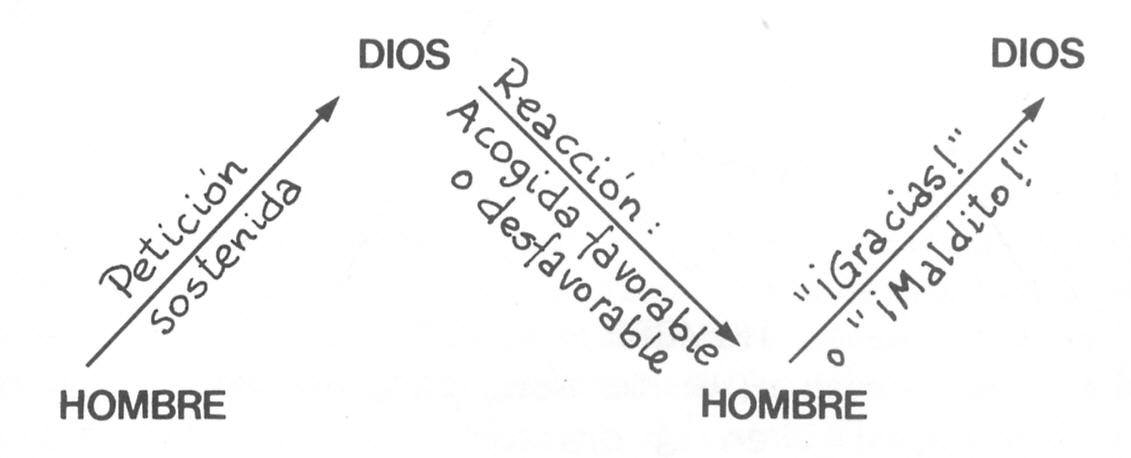 En la religión, el hombre, provocado por una necesidad que no puede satisfacer por sí mismo, lanza a Dios una petición «apoyada» con súplicas, ritos eficaces y sacrificios. Con ello espera influir en Dios para hacerle reaccionar y satisfacer su petición. Tras constatar que ha sido escuchado, entonces, y sólo entonces, pensará en dar gracias. De lo contrario, maldecirá o tendrá muchas ganas de hacerlo, y sólo el miedo se lo impedirá.