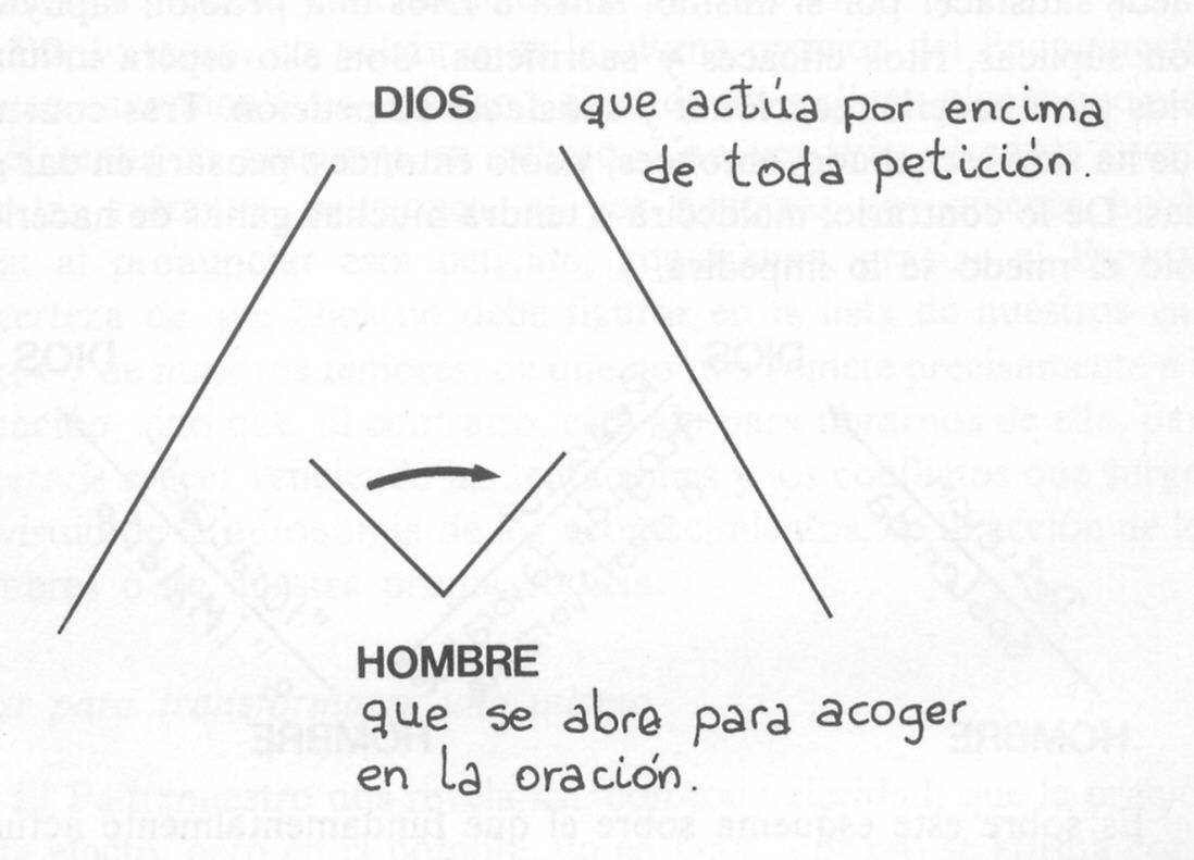 las asegura fundamentalmente a todos los hombres. Lo demás está a merced de la acción del hombre. Es inútil, por tanto, hablar de ello, ni para hacérselo saber a Dios, que está presente y lo sabe, ni para aplacarlo, porque no está enfadado, ni para convencerle de que se muestre útil, porque quiere ser inútil, ausente, inaprehensible e inutilizable para las necesidades del hombre. Tal es la condición normal del hombre, y así la reconoce y la vive también el creyente en su oración.Por lo que hace al Reino, a la renovación de la libertad del hombre, también en esto sabe ya el Padre lo que necesitamos. Somos nosotros los que no lo sabemos, o no lo suficiente; es por nosotros por quienes hablamos, por quienes formulamos las peticiones; es sobre nosotros sobre quienes actúa la oración, no sobre Dios.