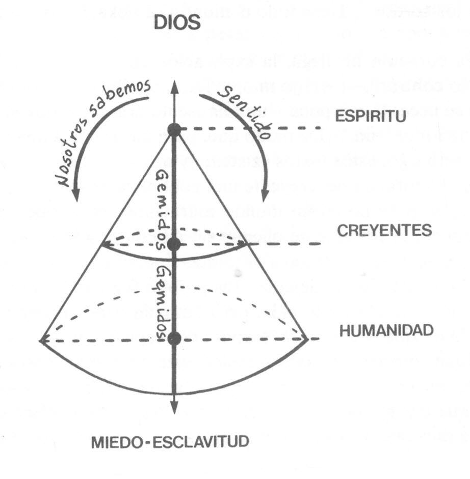 Esta construcción —llamémosla el «cono del gemido»— tiene una base muy amplia: toda la «creación», toda la humanidad (8, 18-22). Entregada por Dios al poder de la nada, de la muerte —la vida orgánica lleva consigo la muerte, y Dios deja que la vida siga sus propias leyes—, la humanidad gime. De hecho, ese gemido contiene una esperanza, una impaciente espera de ser liberada de la corrupción, de acceder a la libertad y a la gloria que los hijos de Dios heredarán de él y compartirán con él. Pero sucede que sólo los hijos de Dios lo saben. Aunque existe esperanza, los hombres que gimen aún no la perciben. Se trata de una esperanza objetiva: de hecho —aunque sólo los creyentes lo perciben: «Pues sabemos» (8,22)—, el gemido de la humanidad es el dolor de parto.