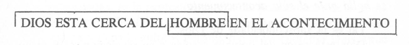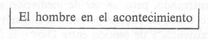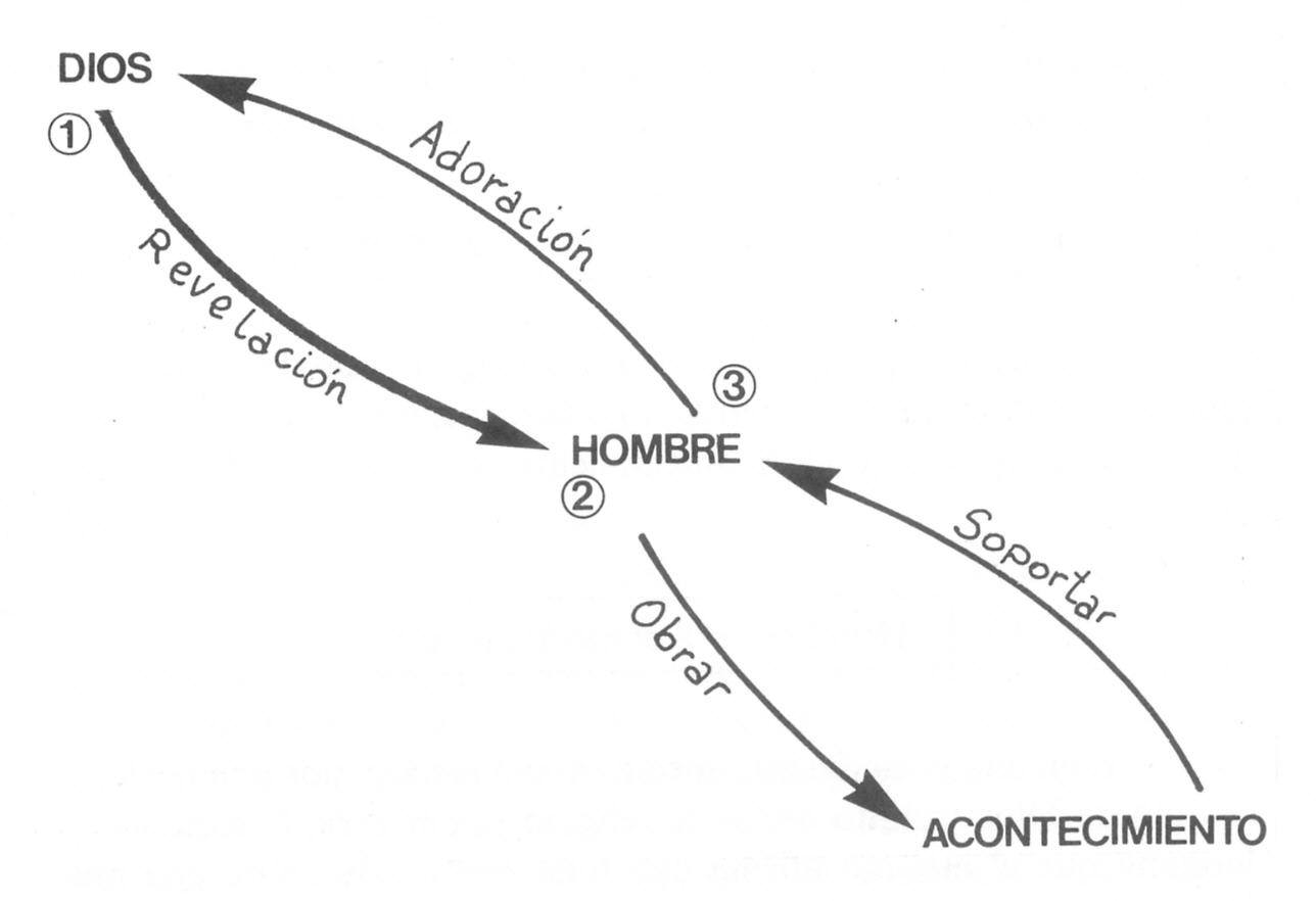 Los recuadros del esquema lo indican debidamente: ninguna relación se cierra sobre sí misma, ni Dios-Hombre, ni Hombre-Acontecimiento. Tampoco ninguna de ellas anula a la otra. Ambas se imbrican mutuamente. Y el hombre está en el centro. Porque él es quien, del lado de Dios, ha de recibir y obtener el Sentido, para llenar con él su corazón y su libertad. Y del lado del acontecimiento, del desenvolvimiento práctico de la vida, debe proceder de manera libre y autónoma. O mejor, el hombre está en el centro porque es él quien en su combate, en su existencia entregada a las formas del mundo, en su responsabilidad para consigo mismo y con el mundo, está constantemente buscando sentidos y, por eso mismo, necesitado (y a la búsqueda) del Sentido, bajo cuya atracción podrá realizar lo más posible una existencia y un mundo de sentido.