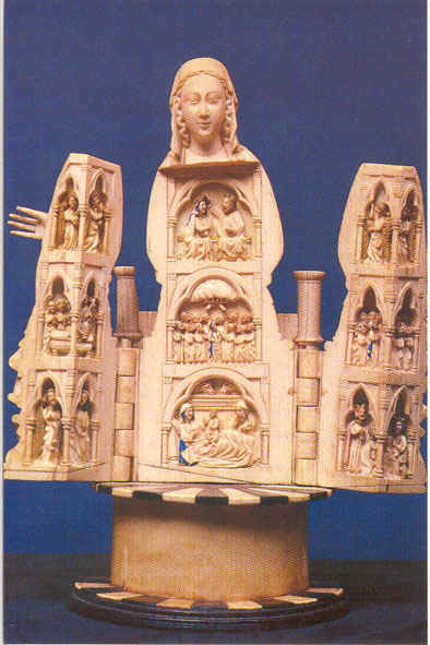 Esta original imagen de la Stma. Virgen, que es realidad es una especie de "tríptico" con las dos opciones de abierto y cerrado, se encuentra en el pequeño Museo del Monasterio de las MM. Clarisas de la localidad de ALLARIZ, en la provincia de Orense. Es una pequeña talla de marfil, de no más de 35 cms. de altura, que tiene la particularidad de abrirse en forma de "tríptico" y en sus tres cuerpos (centro y alas laterales) muestra una primorosa labor de talla, con diversas escenas de la vida de Jesús y de María. Al