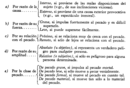 inminente contingencia de algún mal. De donde el peligro de pecado puede definirse en abstracto la inminente contingencia de ofender a Dios; y en concreto, todo aquello que nos mueve al pecado.El peligro de pecado puede ser: