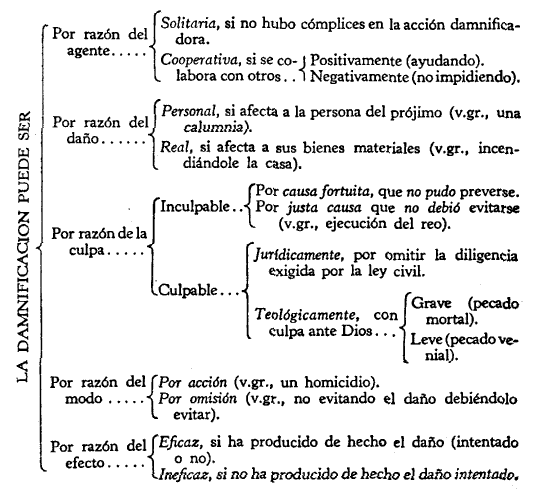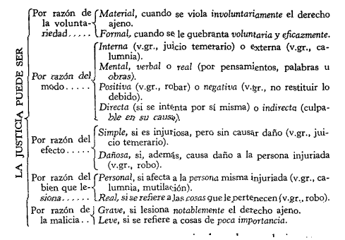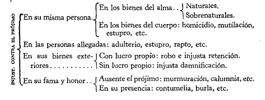 Dejando para sus lugares correspondientes (según el plan de nuestra obra) las que se oponen a la justicia legal y distributiva y a las diversas modalidades de la justicia imperfecta, he aquí en cuadro esquemático las que se refieren u oponen a la justicia conmutativa, que estamos estudiando en estos capítulos relativos a los deberes para con el prójimo como persona particular: