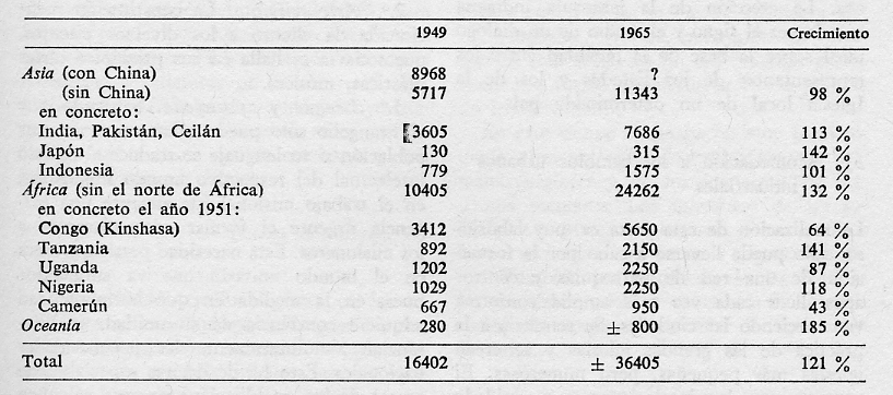 Si bien todas estas cifras son difícilmente verificables y por tanto pueden discutirse, sin embargo cabe sacar la siguiente conclusión: Aun cuando la población de los tres continentes aquí estudiados haya pasado de 1600 millones en 1949 a 2100 millones aproximadamente en 1965, no obstante el correspondiente crecimiento de la población católica es muy considerable, a saber, de 16 a 36 millones (es decir, de un 125 a un 171 %). Naturalmente, fuera de África negra, el porcentaje no es muy elevado.