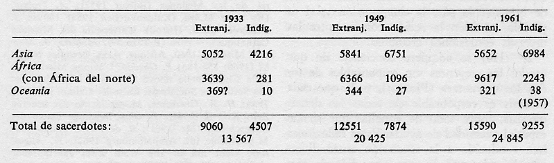Se pone de manifiesto que el porcentaje de indígenas subió del 33 % al 38 %, para bajar luego al 37 %. La situación actual exige intensos esfuerzos para conseguir sacerdotes indígenas, y religiosos de ambos sexos. Especialmente África es el continente cuyo cuadro director indígena apenas crece en relación con la masa de los creyentes y con los misioneros extranjeros.
